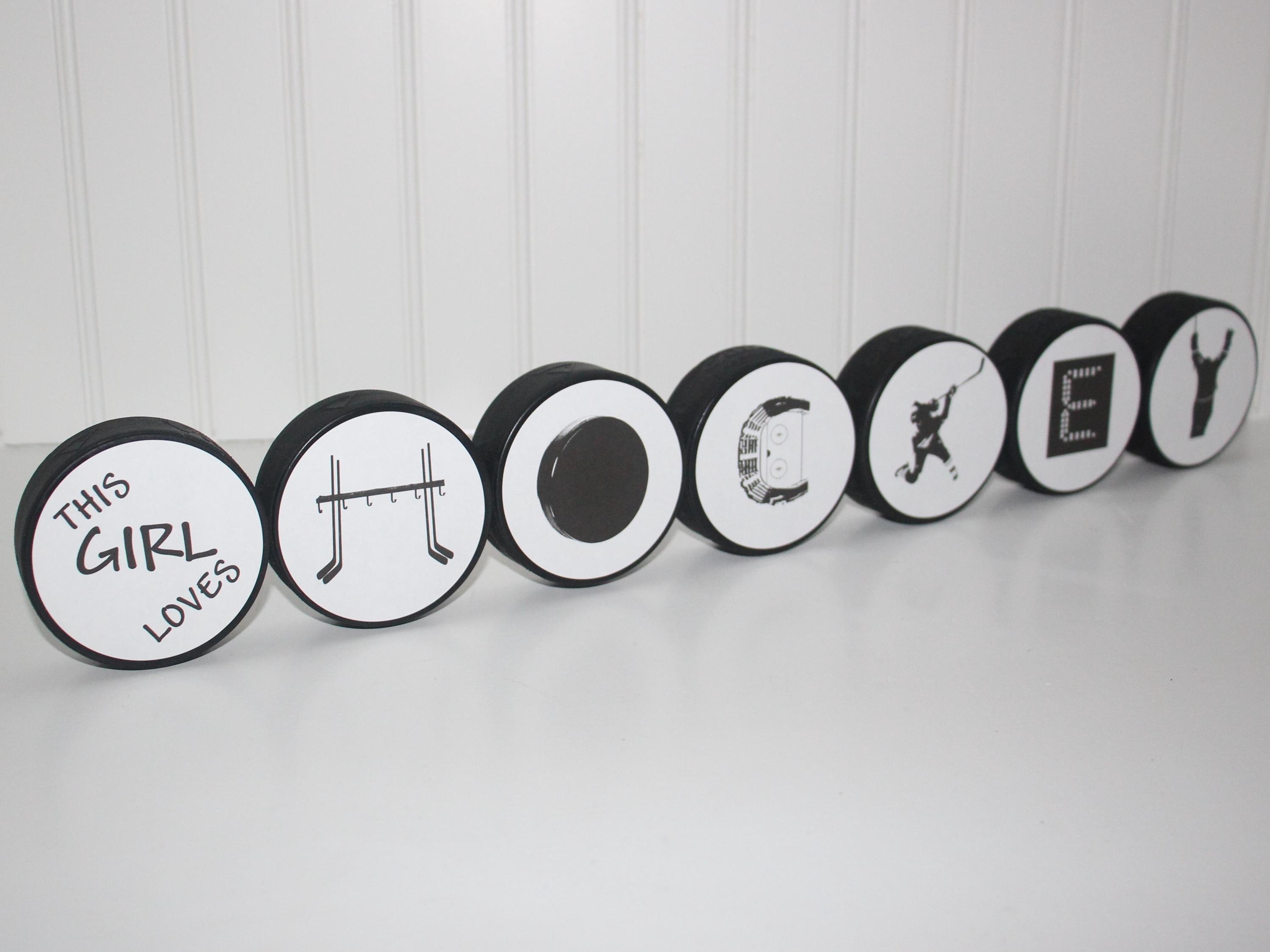 "This Girl Loves HOCKEY" Pucks - Photo Display - We took our unique hockey alphabet and spelled out "HOCKEY" on connecting pucks to create a cool way to display your photos that will add a great conversation piece and hockey touch to any room.