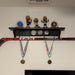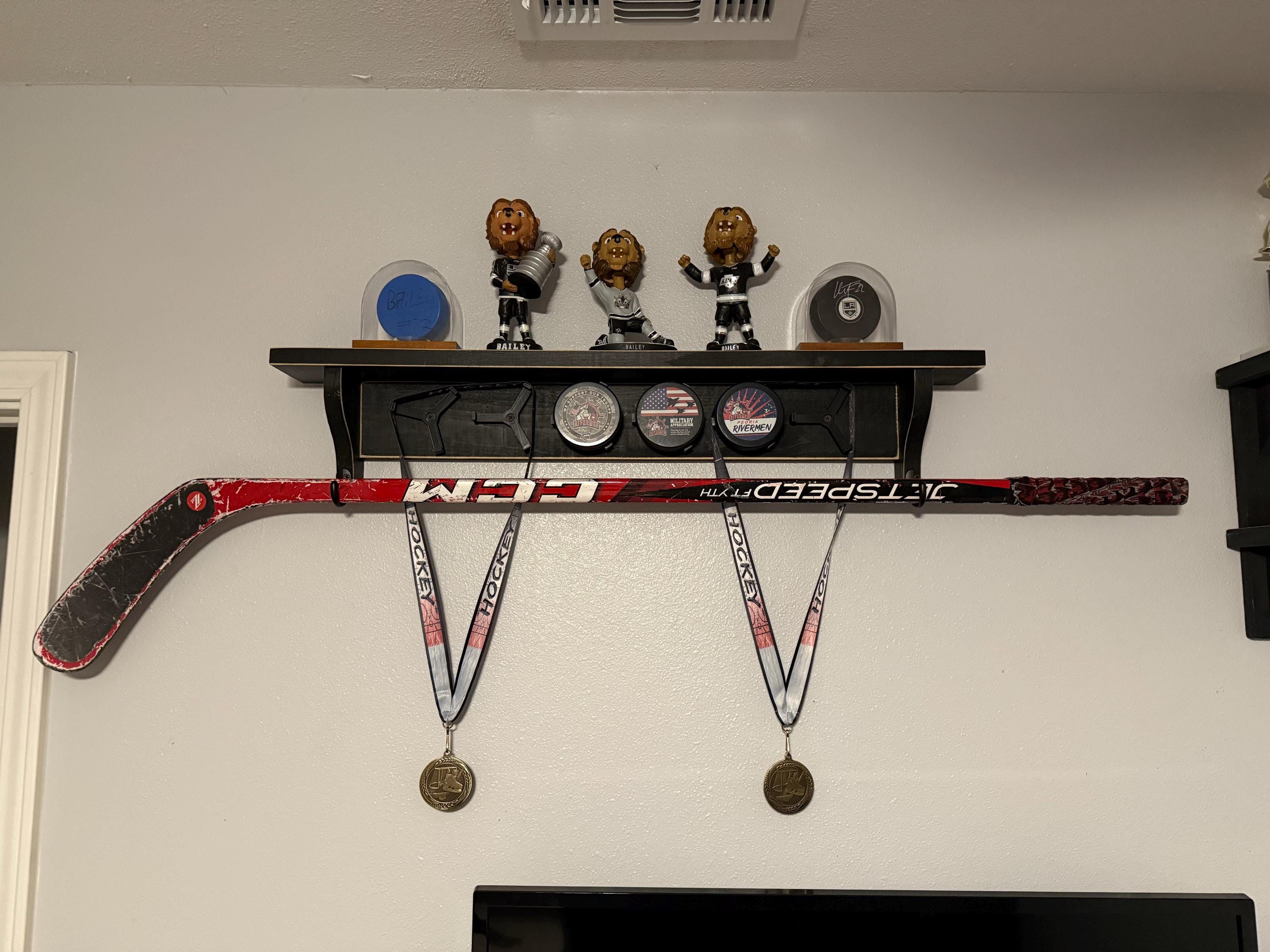 3 Styles: Regular Shelf, Shelf holds a stick which can display ribbons or a jersey or Shelf with hooks for hanging ribbons etc.